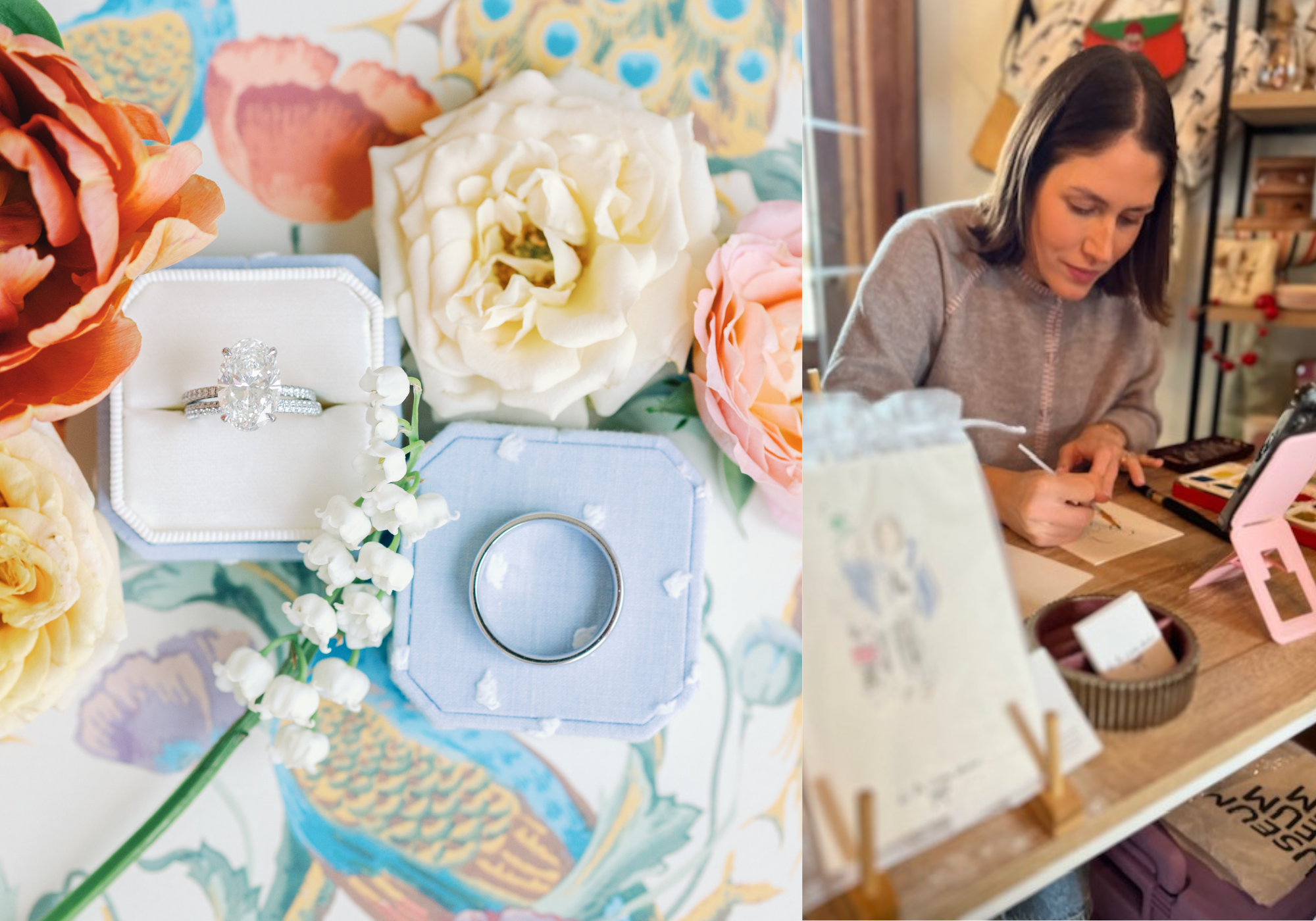 Complimentary Watercolor Portrait: Celebrate your love in an unforgettable way! While you explore our collection, Danielle of de la crem studio will create a stunning watercolor portrait of you and your fiancé!