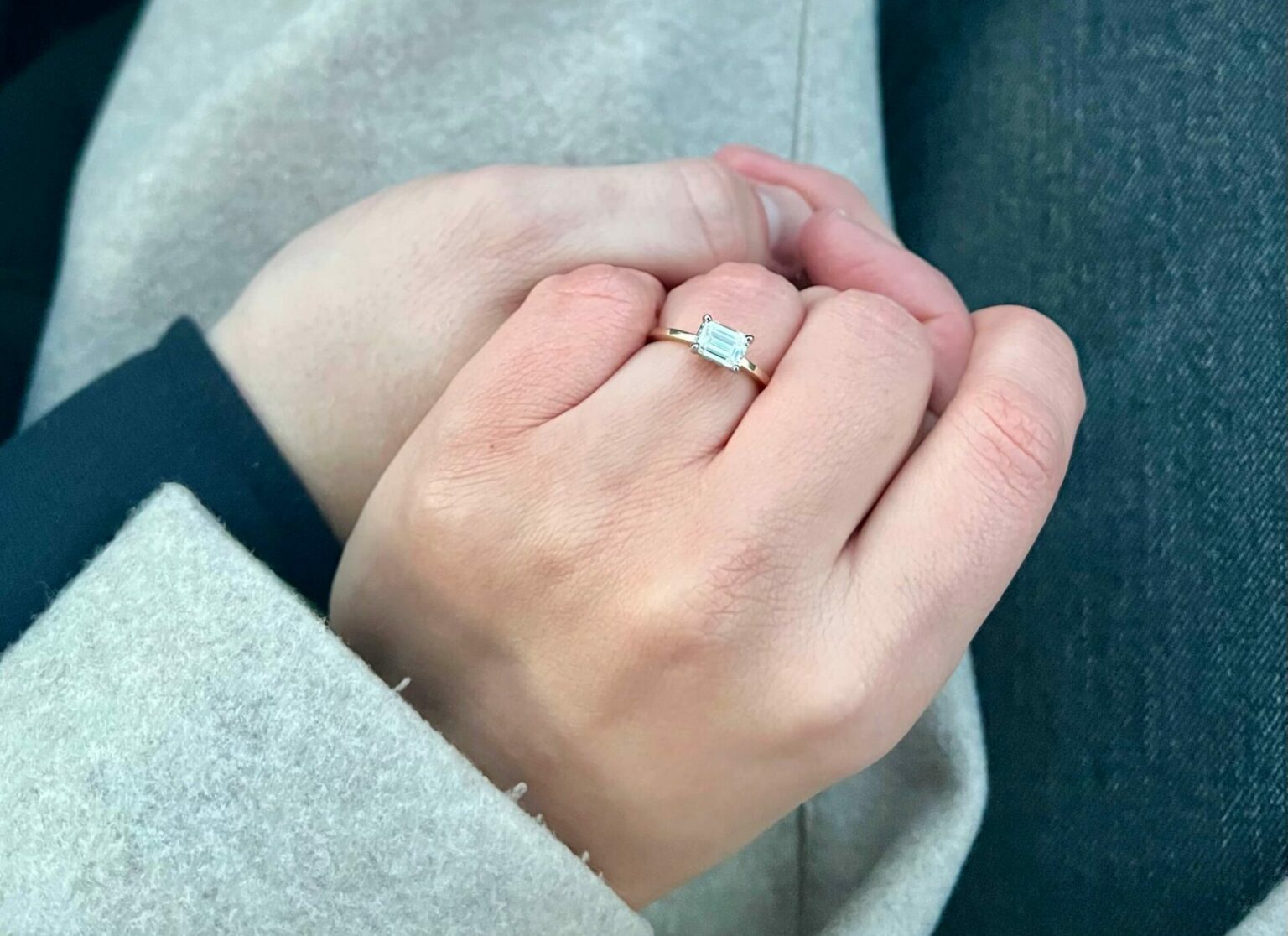 A custom designed east-west set solitaire emerald cut diamond engagement ring.