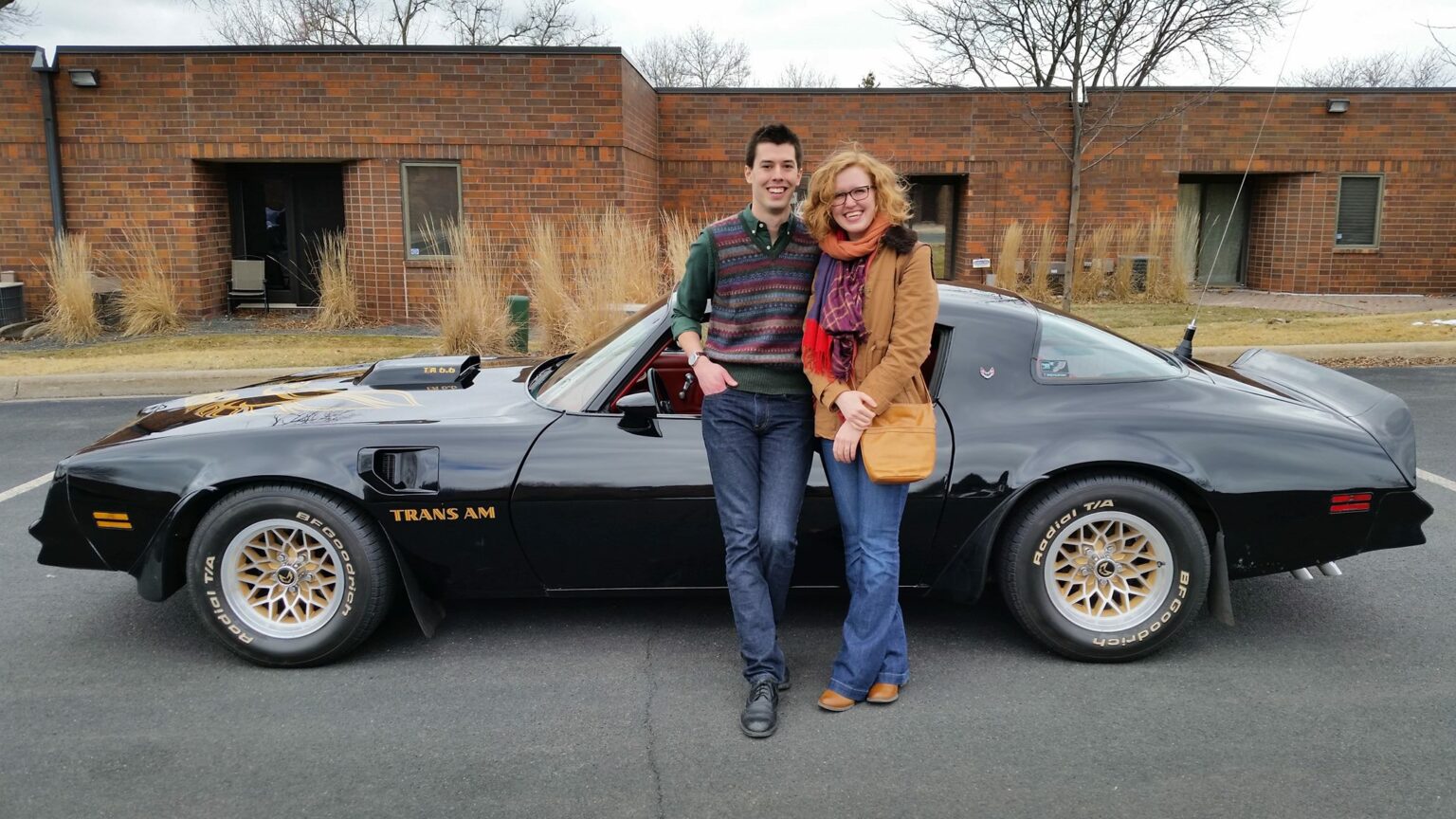 Sam and Megan were planning to visit his family in Iowa on a Friday afternoon in March 2015. He was supposed to pick up Megan from work so that they could leave from there. Instead, Sam borrowed a ’77 Pontiac Trans Am from a family friend and dressed to look like Jake Ryan from the movie. When Sam got on one knee to propose, she was so taken aback that she forgot to say yes. Following the proposal, they drove off to celebrate and share the news with Megan’s family in Bloomington and then in Iowa with Sam’s family.
