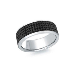 This 8mm wedding band is crafted from 14k white gold and features a tantalum woven center and a polished edge.