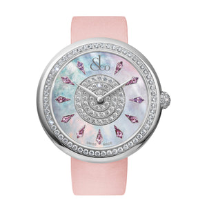 This 38mm watch from Jacob & Co. is crafted from stainless steel and features a diamond bezel, a mother of pearl dial, pink and white diamond markers, and a pink strap.