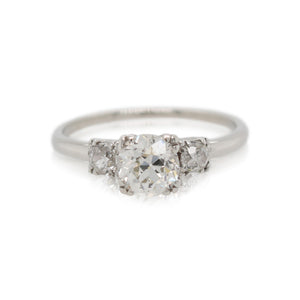 This sparkling ring is crafted from platinum and features a 0.72ct old European cut center diamond and 0.22 total carats of diamonds.