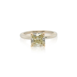 This ring is crafted from 18k white and yellow gold and features a 2.11ct cushion cut fancy brown, green, and yellow diamond.