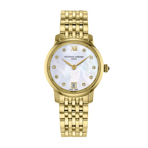With a delicate 30 mm diameter, the Slimline Ladies captures the essence of Frédérique Constant. With a subtle interplay of diamonds, guilloche or mother-of-pearl, the Slimline Ladies stands out with grace and elegance.