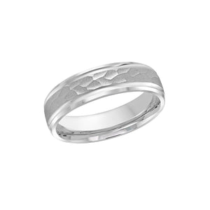 This wedding band is crafted from platinum and features a hammered center and is 6mm wide.