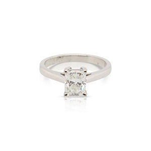 This engagement ring is crafted from platinum and features a 1.25 carat radiant cut center diamond.