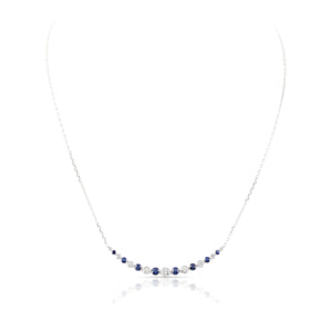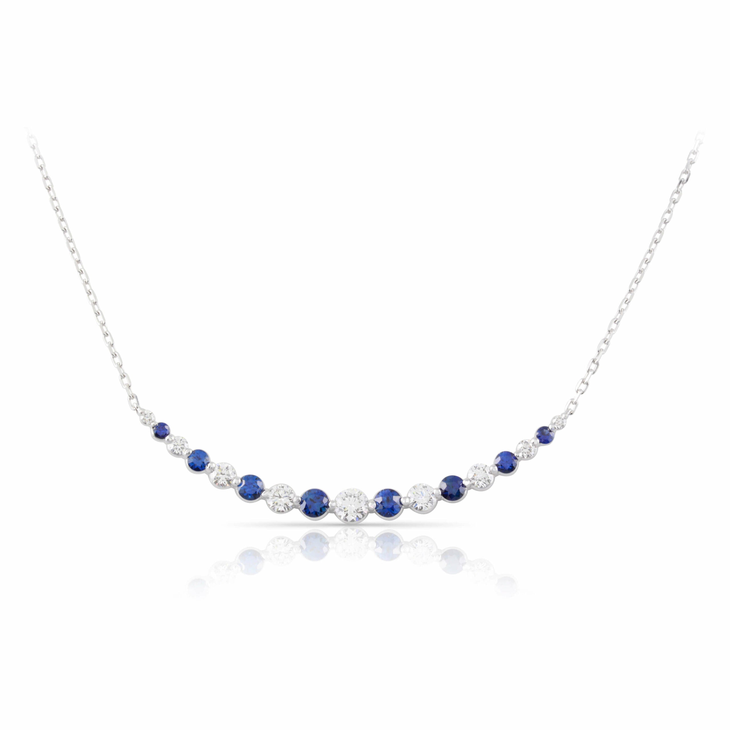 Alternating sapphires and diamonds graduate in size and curve along an 18k white gold chain in this gorgeous pendant necklace. The sapphires total 1.22 carats and the diamonds total 1.00 carats.