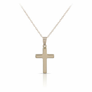 This cross pendant is crafted from polished 14k yellow gold and includes the matching chain.